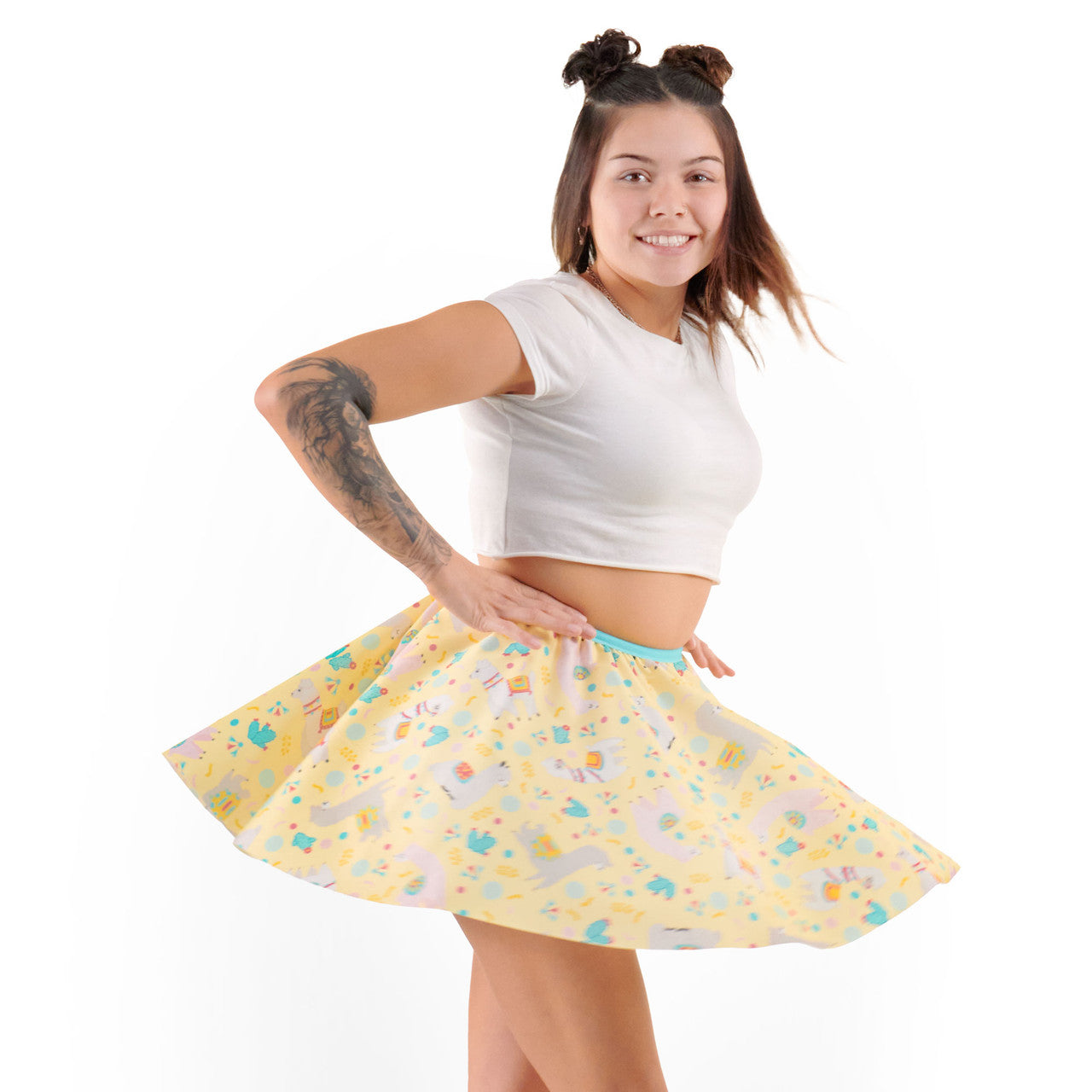 Introducing our adorable circular skirt in a charming light yellow color with a playful twist of colorful alpacas. Made from high-quality and soft polyester, this seamless skirt offers both comfort and durability. You can rest assured that unexpected rain showers won't ruin your day, as the skirt is waterproof.