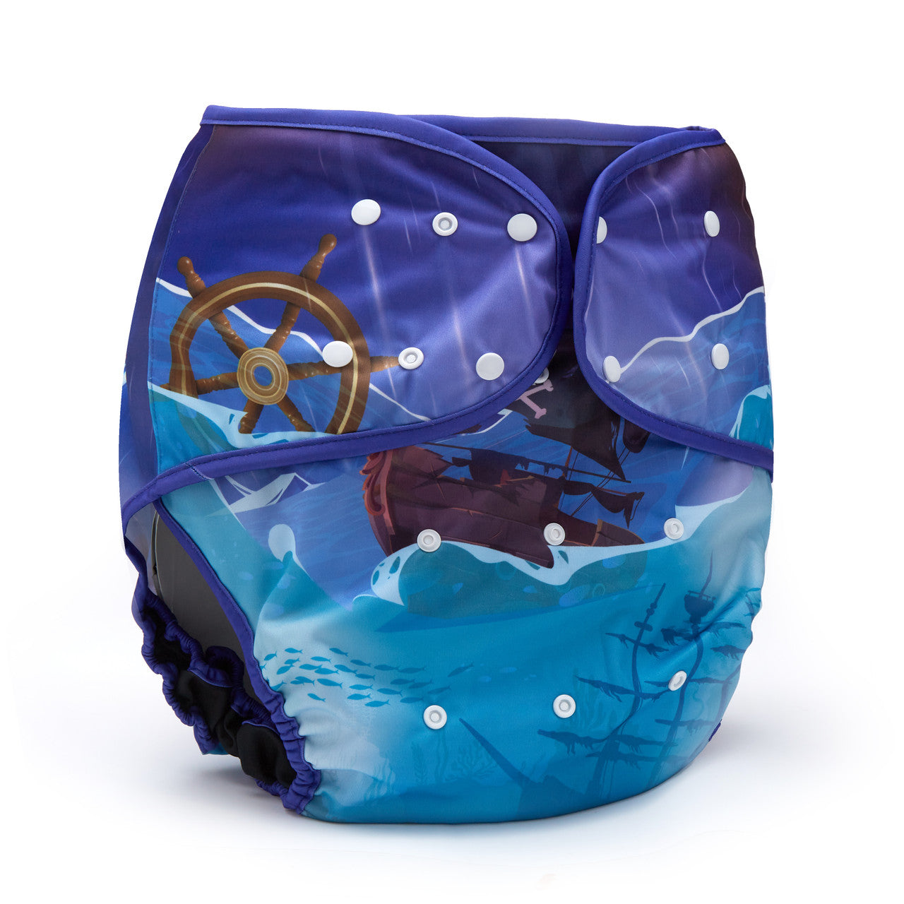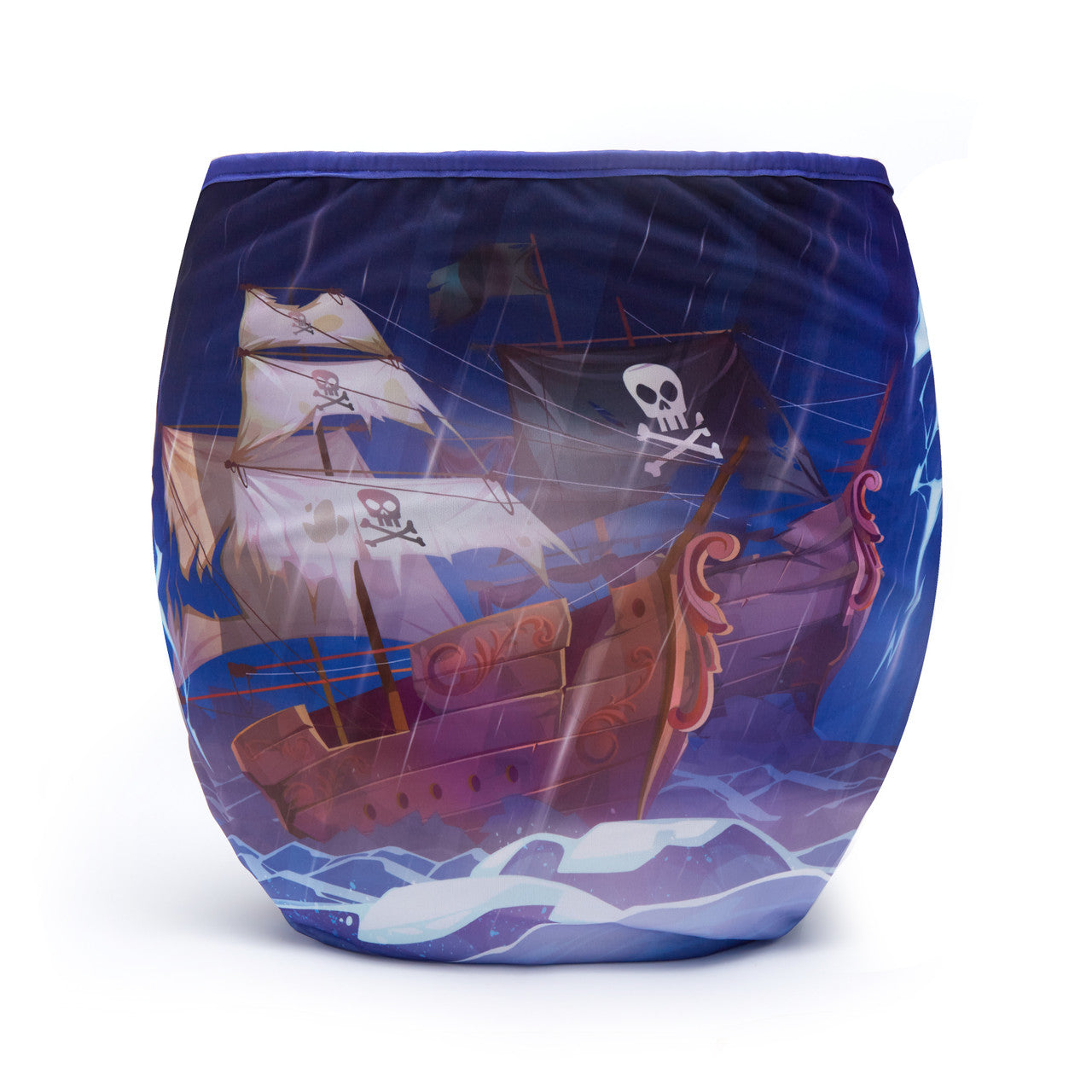 Set sail in the tempest with the Rebel Diaper Wrap! This daring snap-on diaper cover features a pirate ship braving dark and stormy seas, flying the Rebel jolly roger flag high against the tumultuous sky.