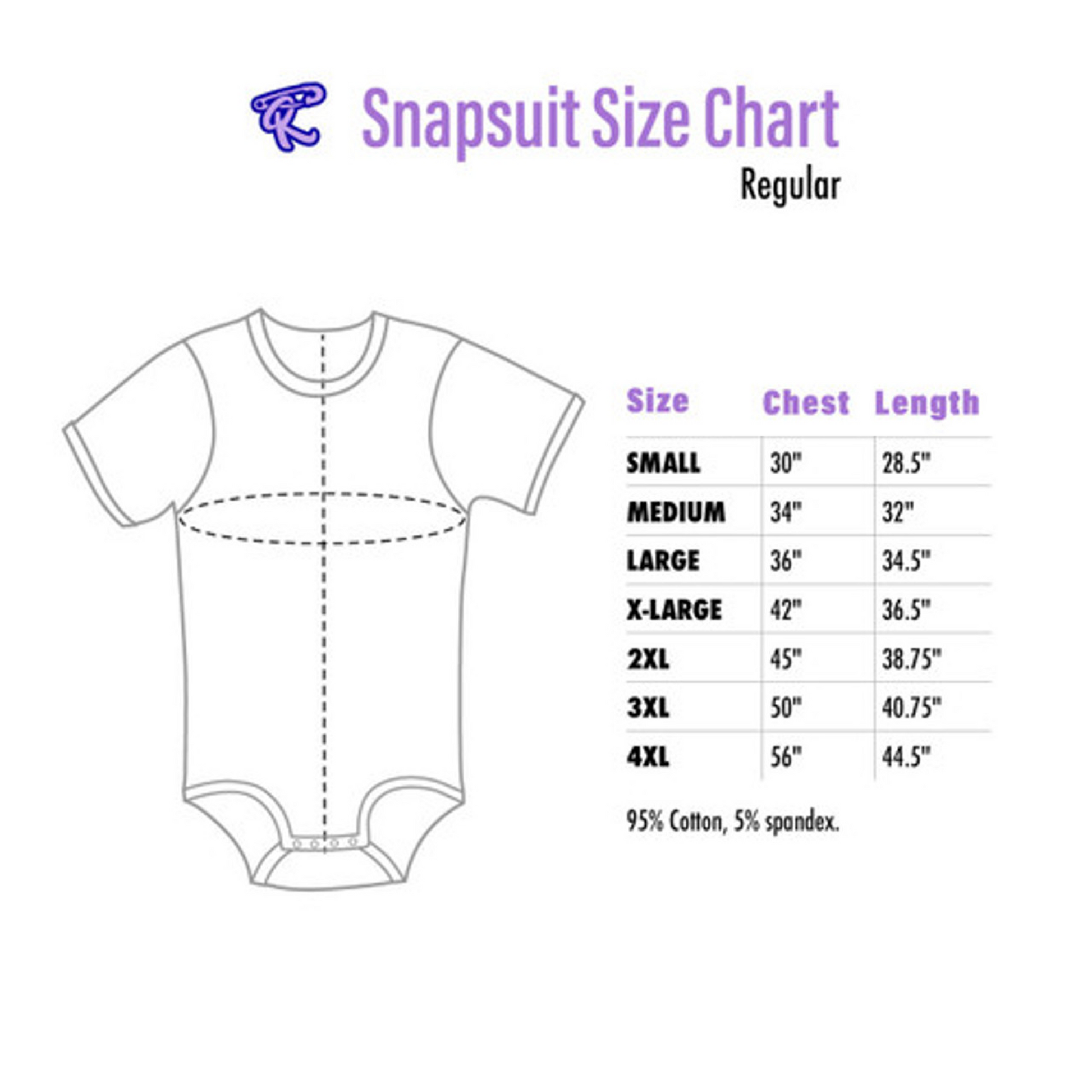 Fits similar to a standard female T-shirt sizing (size up one size if you are used to male sizing). This Snapsuit can stretch up to a few inches longer than listed below and can shrink up to 10% after washing.